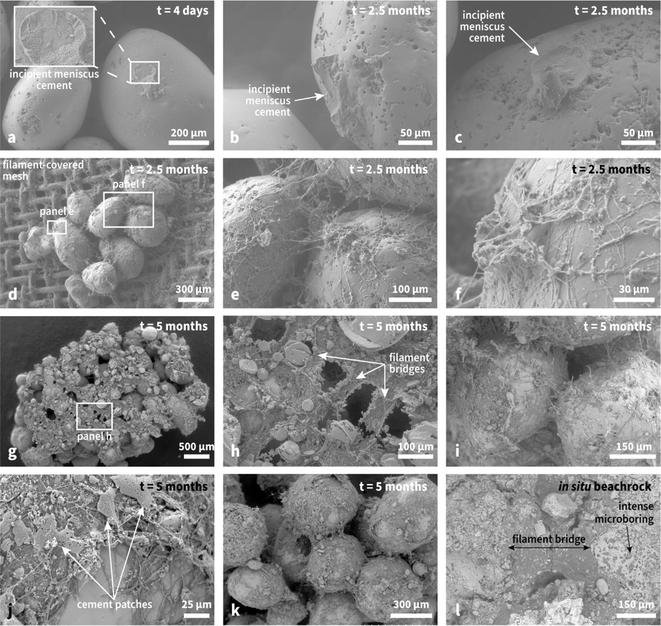 SEM images of samples from field incubation experiments (a–k) and in situ beachrock.