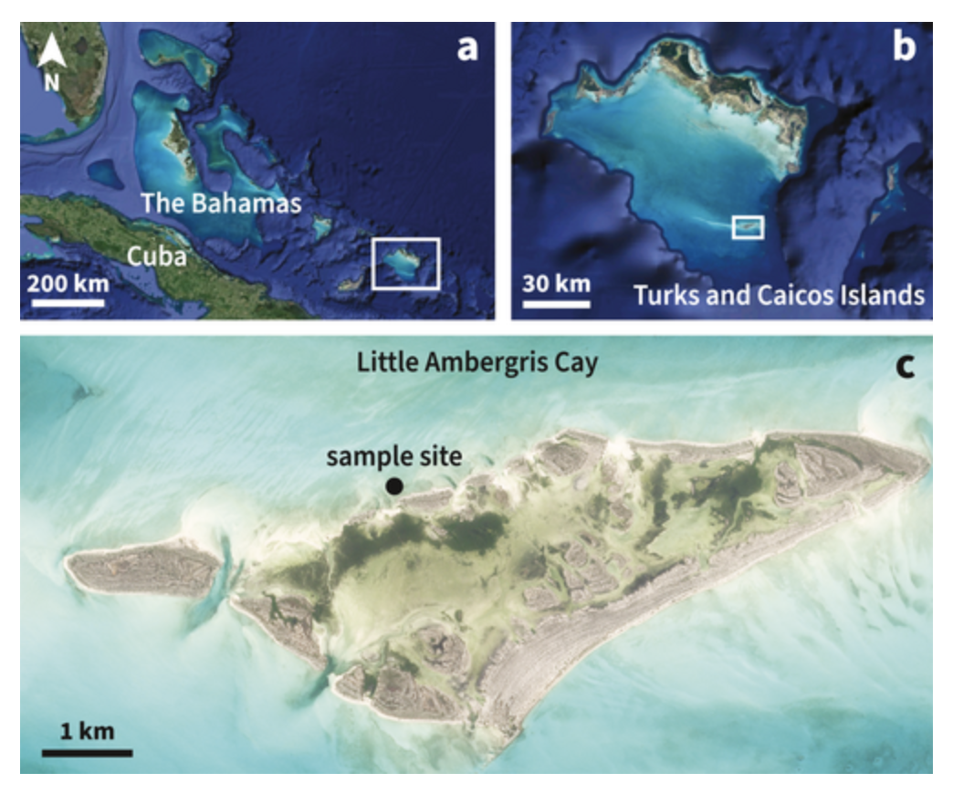 Abstract: Beachrock is a type of carbonate-cemented rock that forms via rapid cementation in the intertidal zone. Beachrock is a valuable geological tool as an indicator of paleoshorelines and may protect shorelines from erosion. Previous studies present a range of hypotheses about the processes enabling rapid beachrock formation, which span purely physicochemical mechanisms to a significant role for microbially mediated carbonate precipitation. We designed a set of in situ field experiments to explore the rates and mechanisms of beachrock formation on Little Ambergris Cay (Turks and Caicos Islands). Our field site has evidence for rapid beachrock cementation, including the incorporation of 20th century anthropogenic detritus into beachrock. We deployed pouches of sterilized ooid sand in the upper intertidal zone and assessed the extent of cementation and biofilm development after durations of 4 days, 2.5 months, and 5 months. We observed incipient meniscus cements after only 4 days of incubation in the field, suggesting that physicochemical processes are important in driving initial cementation. After 2.5 months, we observed substantial biofilm colonization on our experimental substrates, with interwoven networks of Halomicronema filaments binding clusters of ooids to the nylon pouches. After 5 months, we observed incipient beachrock formation in the form of coherent aggregates of ooids up to 1 cm in diameter, bound together by both networks of microbial filaments and incipient cements. We interpret that the cyanobacteria- dominated beachrock biofilm community on Little Ambergris Cay plays an important role in beachrock formation through the physical stabilization of sediment as cementation proceeds. Together, this combination of physicochemical and microbial mechanisms enables fresh rock to form in as little as 150 days.