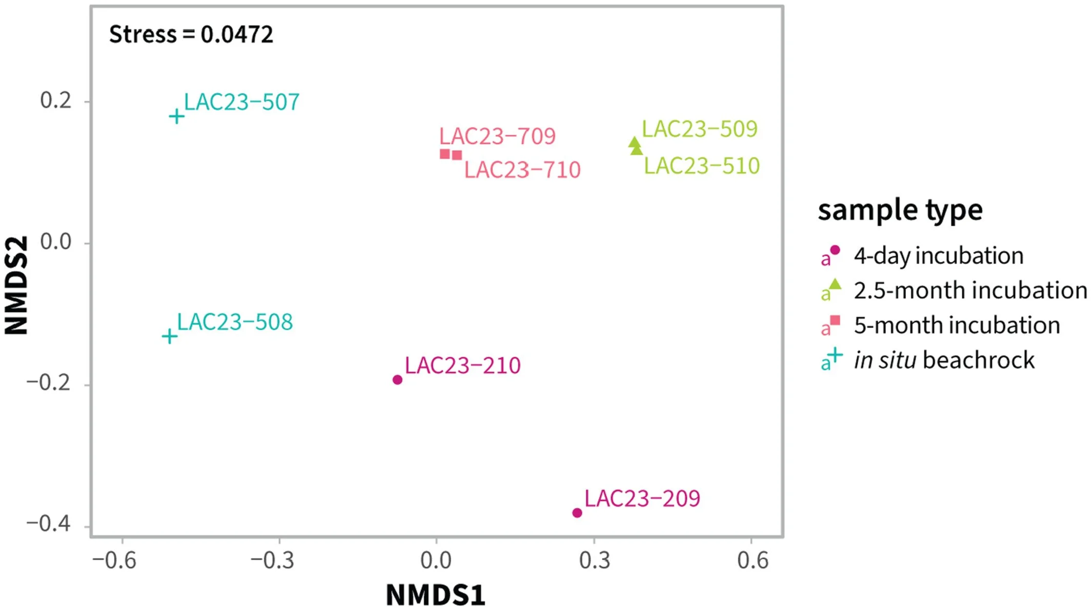 NMDS plot showing variance in microbial community as a function of incubation duration and compared with in situ beachrock samples
